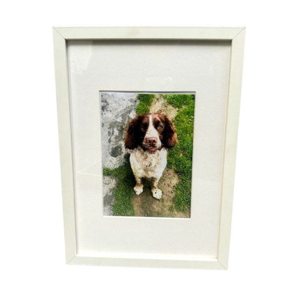 Urna in legno a cornice fotografica di colore bianco con passepartout. Adatta da animali fino a 20 kg